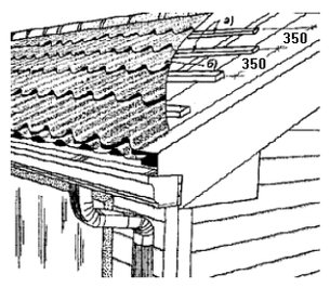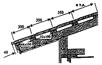 Обрешетка под листы металлочерепицы выполняется из антисептированных досок сечением 100 х 32 мм с расстоянием по осям для листов «Классик» расстояние от крайней обрешетины - 300 мм, последующие расстояния между осями - 350 мм (рис. 3.6).