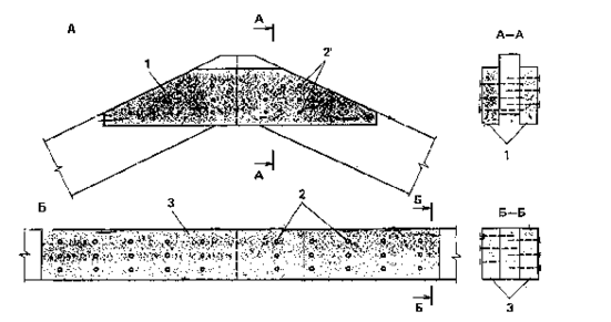 Рисунок 3.5 - Узел соединения стропил в коньке: А - верхняя накладка; Б - нижняя накладка; 1- фигурная накладка; 2 - гвозди; 3 - прямоугольная накладка