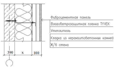 Наружные стены выполнить из керамзитобетонного камня толщиной 390 мм, М50, плотностью Y=1200кг/м3. Цоколь - фасадная вентилируемая система "Краспан", панели "Краспан Гранит". Стены - фиброцементные панели "KMEW"(Япония), подконструкцию принять фасадной вентилируемой системы "Краспан".