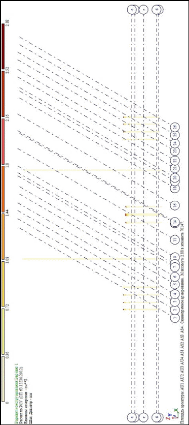 2.1.11 Армирование колонн выполнено с помощью модуля армирования «Стержень» - это симметричное армирование относительно местных осей сечения. Использован алгоритм дискретной арматуры, в котором стержни приоритетно располагаются в угловых зонах сечения, а распределенная арматура используется при необходимости. Схема расположения арматуры для прямоугольного сечения показана на рисунке 2.31. Вид сечения – со стороны отрицательной полуоси Х местной системы координат.