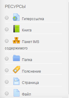 Курс может содержать несколько различных типов ресурсов. Ресурсы курса содержат ссылки на материалы, необходимые для изучения темы. Основные ресурсы курса: