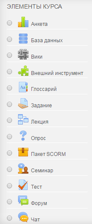 Элементы курса — это интерактивные модули, с помощью которых пре- подаватель в своем курсе организует учебный процесс (размещает материалы курса, проводит тестирование, общается со слушателями). Система располагает большим разнообразием модулей, которые могут быть использованы для создания курсов любого типа: