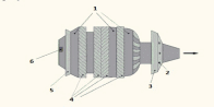 Рисунок 1.4 – Очистной скребок типа СКР1. 1– прокладочные диски; 2– байпасные устройства; 3– передний ведущий диск; 4– чистящие диски; 5– задний ведущий диск; 6– передатчик.