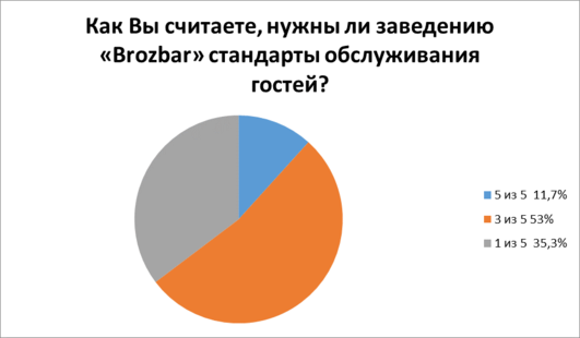 На вопрос «Как Вы считаете, нужны ли заведению «Brozbar» стандарты обслуживания гостей?», респондентам было предложено выбрать 1 вариант ответа, где 5 это полное согласие, а 1 полное несогласие с вопросом.