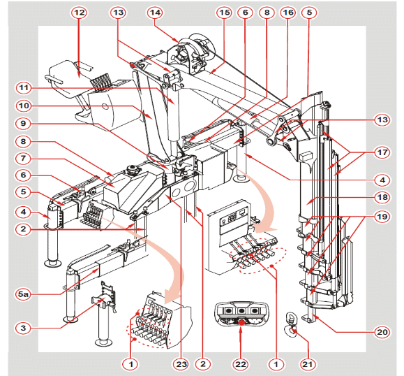 1 – пульт управления; 2 – крепежные шпильки; 3 – поворотный цилиндр опоры; 4 – неповоротный цилиндр опоры; 5 – балка опор; 5а - телескопическая балка опор; 6 – фиксатор балки опор ручного выдвижения; 7 – бак гидравлический с указателями температуры и уровня масла; 8 – механизм поворота; 9 – основание крана; 10 – колонна крана; 11 – главный цилиндр подъема; 12 – верхнее сидение с пультом управления; 13 – траверса; 14 – лебедка; 15 – главная стрела; 16 – цилиндр дополнительной стрелы; 17 – цилиндр выдвижения гидравлических выдвижных секций стрелы; 18 – дополнительная стрела; 19 – гидравлическая выдвижная секция стрелы; 20 – механическая секция удлинителя стрелы; 21 – грузовой крюк; 22 – ПДУ; 23 – балансир.