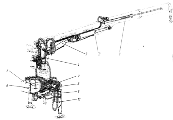 1 – цилиндр телескопирования; 2 – цилиндр второй стрелы; 3 – цилиндр первой стрелы; 4 – система гидроуправления стреловым оборудованием; 5 – гидробак; 6 – управление гидроцилиндрами выносных опор; 7 – механизм поворота; 8 – цилиндр выдвижения выносной опоры; 9 – гидронасос; 10 - цилиндр выносной опоры.
