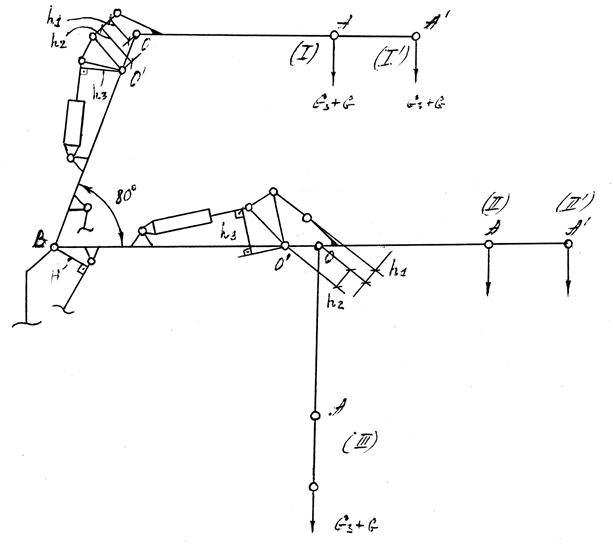 - плечи усилий в механизме складывания относительно шарниров С и С' (рисунок 33). Значения для трех положений манипулятора приведены в таблице 17;