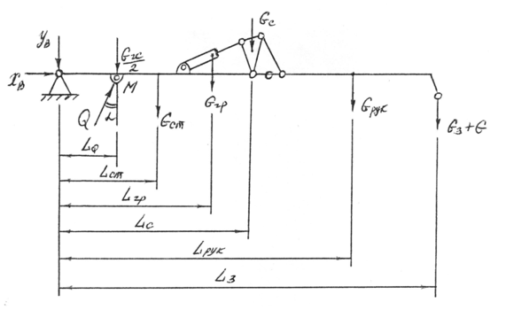 - сумма изгибающих моментов относительно шарнира В от сил тяжести элементов манипулятора.