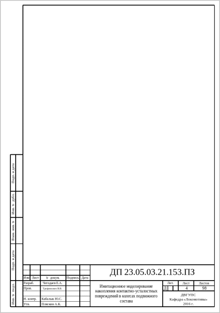 Project thesis is devoted to topical issues related to the increasing automation of the process of research of mechanical objects. To solve this problem the module «Rolling Contact Fatigue» was applied software package "Universal Mechanism", which is designed to simulate the accumulation of contact fatigue damage in the wheels of railway rolling stock. Thanks to this module determined the rate of accumulation of contact fatigue damage in the wheels with different profiles skating surfaces, take into account the effect of wheel profile wear on the rate of accumulation of contact fatigue damage using the GUI analyzed stress simulation processes and the accumulation of damage in the wheel material. In addition, it had been calculated the cost-effectiveness of simulation and identify the cost of implementing a technical solution.