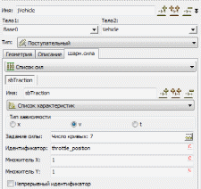 Кроме того, в модель добавлена шарнирная сила sbTraction, которая моделирует силу тяги. Тип этой шарнирной силы задан как Список характеристик. Данный тип силы позволяет задавать зависимость силы от координаты, скорости или времени набором кривых. Поле Идентификатор кривой задает идентификатор, по значению которого будет выбираться кривая из списка. Значение