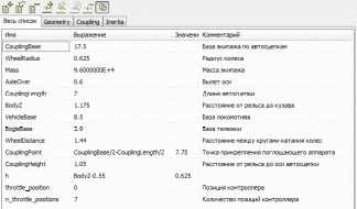 Идентификаторы CouplingBase и Mass применяются в Мастере создания поезда, которые представлены на рисунке 3.1. Их значения задаются в соответствующих колонках. Важно, то, что идентификатор Mass задает полную массу всего экипажа, т.е. сумму всех тел, входящих в модель экипажа.