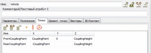 Для связи одномерных моделей экипажей передняя точка прикрепления FrontCouplingPoint, к которой крепится автосцепка предыдущего экипажа. Задняя точка RearCouplingPoint используется для связи с трехмерными экипажами. Данные точки крепления могут принадлежать любому телу в модели экипажа. В опытной модели обе точки связи принадлежат телу Vehicle.