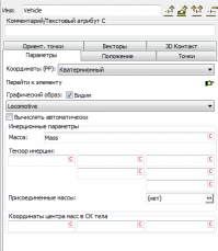Тело с именем Vehicle должно обязательно присутствовать в модели. К этому телу прикладываются внешние силы сопротивления движению и силы торможения. В данном случае в инерционных параметрах тела задана только масса, так как у тела нет вращательных степеней свободы. Масса задана с помощью обязательного для модели экипажа идентификатора Mass, который был представлен в таблице 3.1.