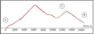 Рисунок 4.32 – Вертикальный профиль пути со станциями: А – Анисимовка; Т – Тигровый; Ф – Фридман