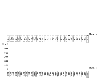 Для лучшей визуализации, как действуют силы в автосцепных устройствах у груженного поезда, вертикальный профиль пути рисунок 4.32 разбит на несколько участков. Первый участок 400–1000 м. показан на рисунке 4.34.