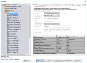 На четвертом шаге требуется указать материал для рассчитываемого твердого тела. В качестве материала модели была выбрана легированная сталь, так как она на практике применяется при прокладке трубопроводов высокого давления.[15] SolidWorks предоставляет большой выбор легированных сталей разнящихся характеристик, для статического анализа ВКР была выбрана следующая (рисунок 2.26).