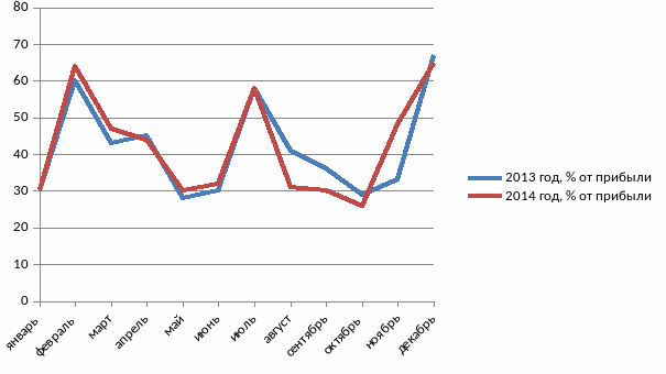 На долю заработной платы сотрудников от прибыли в среднем приходится 42% в 2014 году. Наглядно график расходов на заработную плату сотрудникам представлен на рисунке 2.2.