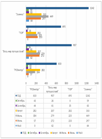 В турфирмах «Весь мир путешествий» и «Заимка» самым продуктивным месяцем 2015 года был июль, в «РОЗинтуре» - август, а в «ТОРе» - июнь (См. Рис. 4). Это обосновывается тем, что в период открытия речной навигации через Амур поток туристов из г. Фуюань не прекращается до самого ее закрытия.