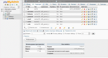 указанные выше поля имеют атрибутыVARCHARи tinyint. Данные столбцы требуются для корректной работы системы регистрации. Для защиты данных пользователь поле passwordшифруется. Для шифрации используется алгоритм шифрования md5.