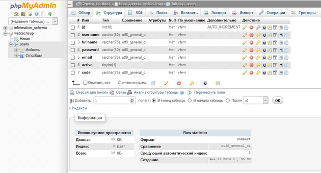 указанные выше поля имеют атрибутыVARCHARи tinyint. Данные столбцы требуются для корректной работы системы регистрации. Для защиты данных пользователь поле passwordшифруется. Для шифрации используется алгоритм шифрования md5.