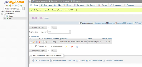 Вся информация по зарегистрированным пользователям попадает в базу данных, где впоследствии и хранится (рисунок 5).