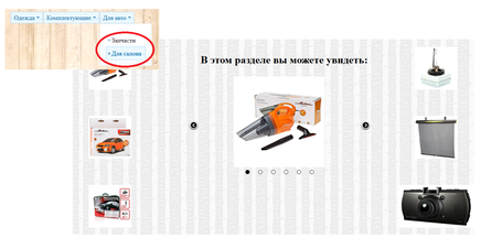 Перейдя по ссылкам, попадаешь в нужный раздел с каталогом товаров, например: Наведя курсор мыши на пункт меню «Для авто», появляется выпадающее меню с выбором раздела «Запчасти» и «Для салона», кликая по ссылке «для салона» осуществляется переход на страницу каталога товаров для салона автомобиля (рисунок 14).
