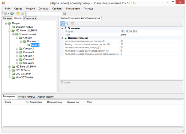Во вкладке «Модули» перечисляются модули, протоколы и каналы связи, которые необходимы для передачи данных именно этой конфигурации. В сроке IP-адреса указывается адрес устройства, с которым связывается данный модуль.