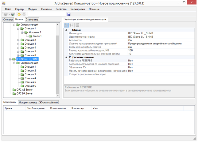 настройках модулей программы AlphaServer нужно указать IP-адреса, с которыми будет связываться данная конфигурация. Модуль IEC Slave опрашивает контроллер , к которому подключены задвижки и датчики на участке магистрального нефтепровода. Настройки модуля IEC Slave представлены на рисунке 2.29.