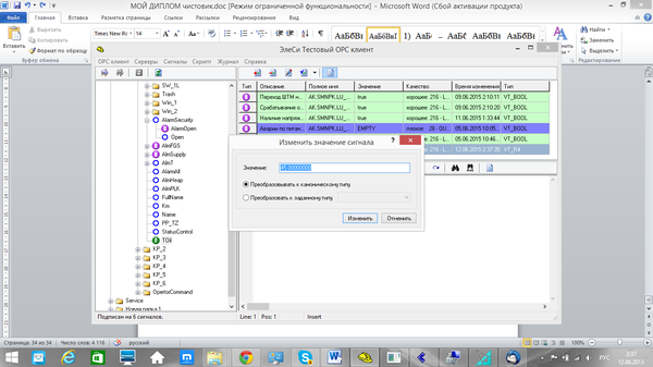 Для проверки отображения вычисляемых сигналов нужно задать значения входящих сигналов в OPCDA Calculator. Выберем сигнал «Положение задвижки» и зададим «1» сигналу «Задвижка открыта», остальным сигналам положения зададим значение «0». На риунках 2.34 и 2.35 увидим, что вычисляемый сигнал «Положение задвижки» изменился.