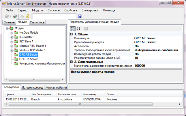Настройка модуля OPC AE Server производится с помощью программы AlpaServer Конфигуратор. В Конфигураторе настраиваются параметры работы модуля. При любых изменениях параметров работы модуля в Конфигураторе новые настройки вступят в силу только после перезапуска сервера.