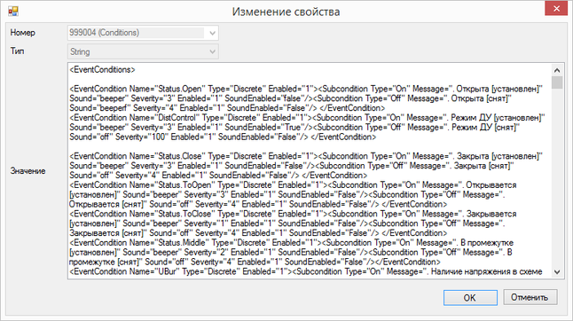 Задание условия генерации оперативного сообщения происходит в свойстве 5000 в программе AlphaServer Конфигуратор. Имя условия прописывается в свойстве сигнала, а само условие в специальном свойстве объекта, которому принадлежит конфигурируемый сигнал. На рисунке 2.27 представлено свойство, в котором прописываются условия генерации оперативных сообщений для сигналов задвижки.
