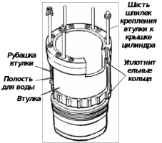 Втулка цилиндра выполнена из чугуна, имеет рубашку, образующую полость охлаждения, и прикреплена шпильками к крышке цилиндра. Втулка должна быть не только прочной, но и жесткой. От нее необходимо интенсивно отводить тепло, образующееся при сгорании топлива, иначе нормальная работа дизеля невозможна. Охлаждение средней части наружной поверхности втулки тепловозных дизелей осуществляется водой. При охлаждении водой температура станок втулок со стороны поршня не должна превышать 150—180°С.