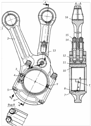 Шатуны — выполнены из легированной стали (рис. 1.3) со стержнями двутаврового сечения, прицепного типа, состоят из главного 2 и прицепного 15 шатунов. Для повышения усталостной прочности поверхности шатунов и крышки дробе-наклепываются. Поршневые подшипники шатунов выполнены в виде стальных втулок и залиты свинцовистой бронзой. Оба шатуна ШПГ имеют проточенные каналы для подвода масла во внутреннюю полость поршня для охлаждения, а также смазки пальцев поршня при работе двигателя. Шатуны соединены между собой пальцем 13, который устанавливается во втулке 12, запрессованной в проушине главного шатуна.