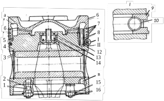 | Рисунок 1.4 – Устройство поршня дизеля типа Д49, где:1-шпилька; 2,12-втулки; 3-палец; 4-стопорное кольцо; 5-уплотнительное кольцо; 6-головка; 7-кольца компрессионные; 8,9-кольца маслосъёмные; 10-расширитель; 11-тронк поршня; 13-стакан; 14-пружина; 15-проволока; 16-гайка; а - полость; б, в - каналы. |