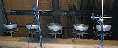 Как и в нанесении методом «Роликового наката», тут происходит нанесение покрытия в несколько слоев с предварительной сушкой, после нанесения каждого слоя. Феска ставится в крутящийся держатель и из форсунки подается покрытие, которое ровным слоем по окружности ложится на поверхность, слой за слоем.