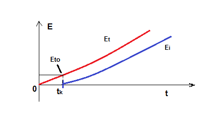 Например, температуру в области рабочего спая определяли по величине, измеренной ЭДС (Ei) суммированной с ЭДС табличной (Eto) для данной комнатной температуры (температура при которой находится измерительный прибор): E = Ei + Eto. Если, например, температура в комнате 20 °C, то для термопары медь-константан для данной температуры значение Eto = 0,790 мВ - см. градировочную таблицу ТХА. Допустим показания (измеренная ЭДС) термопары медь-константан Ei = 2,119 мВ. В этом случае ЭДС, которую нужно использовать для определения температуры рабочего спая по таблицам равна: E = 0,790 + 2,119 = 2,909 (мВ). Используя таблицы получаем значение температуры в области рабочего спая t = 70 °C. На рисунке показана зависимость для этого случая величины, измеренной ЭДС (Ei) и табличной (Et) от температуры.