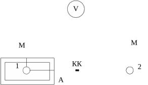 | Рисунок 3.2 – Принципиальная схема подключения термопары, где: (М) – медь, (К) – константа, 1- свободный конец находится при постоянной температуре (тающий лед, 0°С), 2 – рабочий спай |