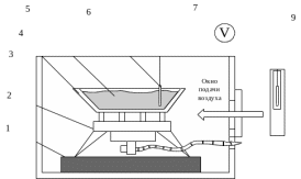 | Рисунок 3.1 – Моделирование термодинамических процессов, протекающих в шатунно – поршневой группе дизеля типа Д49, где: 1 – муфель или кирпич, 2 – газовая горелка, 3 – камера, 4 – посуда с тефлоновым покрытием, 5 – масло, 6, 9 – термопара, 7 – вольтметр |