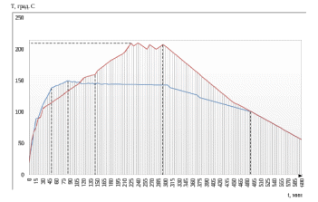 | Рисунок 3.4 – Показания температур, полученных в ходе эксперимента, где синяя линия – температура масла, красная линия – температура емкости в различные моменты времени. |