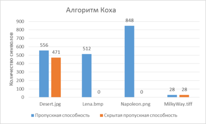 Полученные экспериментально значения пропускной и скрытой пропускной способности стегосистем, использующих при встраивании алгоритм Коха-Жао представлены на рисунке 4.