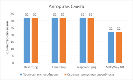 На рисунке 5 представлены полученные в результате экспериментов значения пропускной и скрытой пропускной способности стегосистем, использующих при встраивании алгоритм Смита-Комиски.