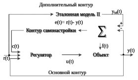 Согласно структурной схеме, показанной на рисунке 1.9, принцип работы АСЯЭМ состоит в следующем, если e(t)=yм(t)-y(t)0, т.е. выход объекта не соответствует желаемому поведению, то контур самонастройки осуществляет изменение настраиваемых коэффициентов адаптивного регулятора (АР), который формирует такое управление u(t), которое действуя на объект заставляет yм(t)-y(t)0. Очевидно, что при e(t)=0, контур самонастройки перестает изменять коэффициенты АР, т.к. поведение выхода объекта идентично поведению выхода ЭМ. В таком случае часто говорят о «совершенном слежении за моделью». Итак, по окончанию процесса адаптации, т.е. начиная с некоторого момента времени (t1) можно полагать выполненным условие e(t)=0 или считать отключенным дополнительный контур, если конечно f(t)=0 при t1t.