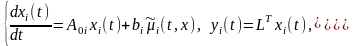 в ып ол ни в р яд м ат ем ат ич ес ки х п ре об ра зо ва ни й, о су ще ст ви м, т ак им о бр аз ом, п ер ех од о т м од ел и р об от а в в ид е у ра вн ен ий (1), (2) к с та нд ар тн ой м ат ем ат ич ес ко й з ап ис и в в ек то рн о-м ат ри чн ой ф ор ме. Т ог да, в п ре дп ол ож ен ии д ей ст ви я н а к аж до е и з з ве нь ев м ан ип ул ят ор а в не шн их н ек он тр ол ир уе мы х в оз му ще ни й, у ра вн ен ия д ин ам ик и м ан ип ул яц ио нн ог о р об от а м ож но п ре дс та ви ть в с ле ду ющ ем о бщ ем в ид е