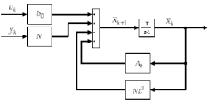 О тм ет им, ч то п ри в ыб ра нн ом к оэ фф иц ие нт е я вн о-н ея вн ой э та ло нн ой м од ел и е е м ож но с чи та ть б ыс тр ой и н а э та пе и ми та ци он но го м од ел ир ов ан ия п ер ей ти к н ея вн ом у п ер ио ди че ск ом у э та ло ну. В э то м с лу ча е и ми та ци он на я с хе ма р ас см ат ри ва ем ой с ис те мы п ри ме т в ид, с оо тв ет ст ву ющ ий р ис ун ку 2.7. С хе ма ц иф ро во го н аб лю да те ля с ос то ян ия (2.14) и зо бр аж ен а н а р ис ун ке 2.8.