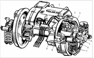 Рисунок 2.1 – Колесно-моторный блок тепловоза с опорно-осевым подвешиванием тягового двигателя: 1 – тяговый двигатель; 2 – упругое зубчатое колесо 3 – шестерня; 4 – колесная пара; 5 – букса; 6 – поводок буксы; 7 – пружины; 8 – кожух редуктора 9 – моторно-осевые подшипники