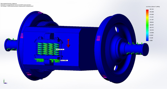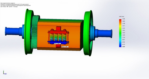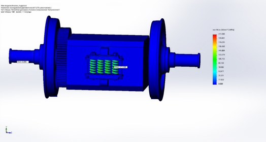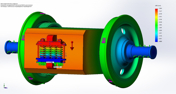 Из всех перечисленных случаев следует, что максимальное напряжение не превышает предел текучести, перемещение в пределах нормы. Следовательно, по результатам статического расчета можно сделать вывод, что нагрузки, действующие в статике, не являются опасными для подвески тягового двигателя.