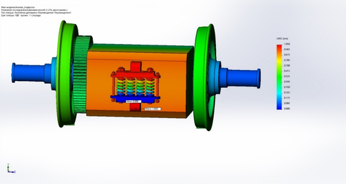 Результаты расчета представлены на рисунках в виде эпюр построенных в программе. На рисунке 3.10 изображена эпюра напряжений, на рисунке 3.11 эпюра перемещений. На эпюрах видно, что максимальное напряжение образуется в пружинах подвески равное 222,065 Н/мм2, а максимальное перемещение равно 3,516 мм.