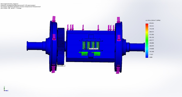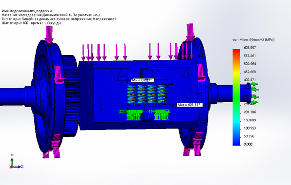 По графику видно, что максимальное напряжение 763,289 Н/мм2, не превышает предел текучести пружин 1090 Н/мм2. Таким образом статический расчет показал удовлетворительный результат.