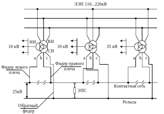 Между обмотками высшего напряжения (ВН) и среднего напряжения (СН) первичное напряжение понижается до 27,5кВ, после чего оно подается на РУ 27,5кВ. Через фидеры по двум фазам a и b напряжение 27,5кВ подается в контактную сеть, обратно возвращается по рельсовой цепи соединённой с фазой c. Участки контактной сети подключают к однофазным линиям, чередуя фазы a и b поочередно, принципиальная схема представлена на рисунке 2.5:
