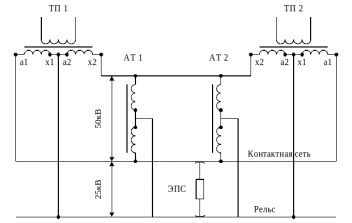 На протяжении участка между тяговыми подстанциями дополнительно устанавливают автотрансформаторы на расстоянии от 8 до 20 километров друг от друга, позволяющие понижать подаваемое напряжение с тяговых подстанций до 25кВ. Напряжение с тяговых подстанций по линиям контактной сети – КП и питающему проводу – П подается на автотрансформатор, средняя точка вывода автотрансформаторов присоединена к рельсу. Таким образом, при движении ЭПС по участку, автотрансформаторы принимают нагрузку поочередно, понижают напряжение, подаваемое с питающего провода до 25кВ, и подают его в контактную сеть.